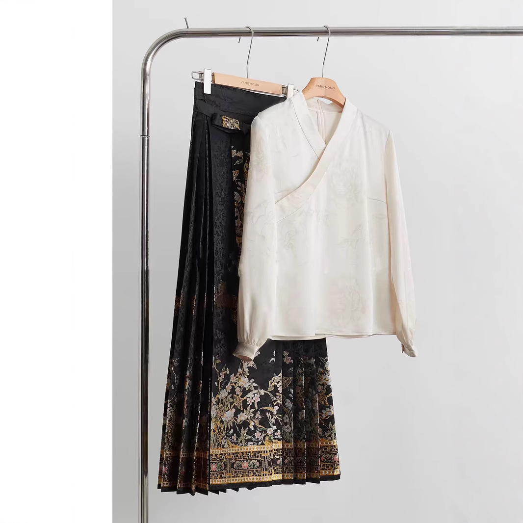 新しい中国風の斜め襟プリントシャツ漢服馬面スカートスーツ 2025 春の女性のハイウエスト小柄な人