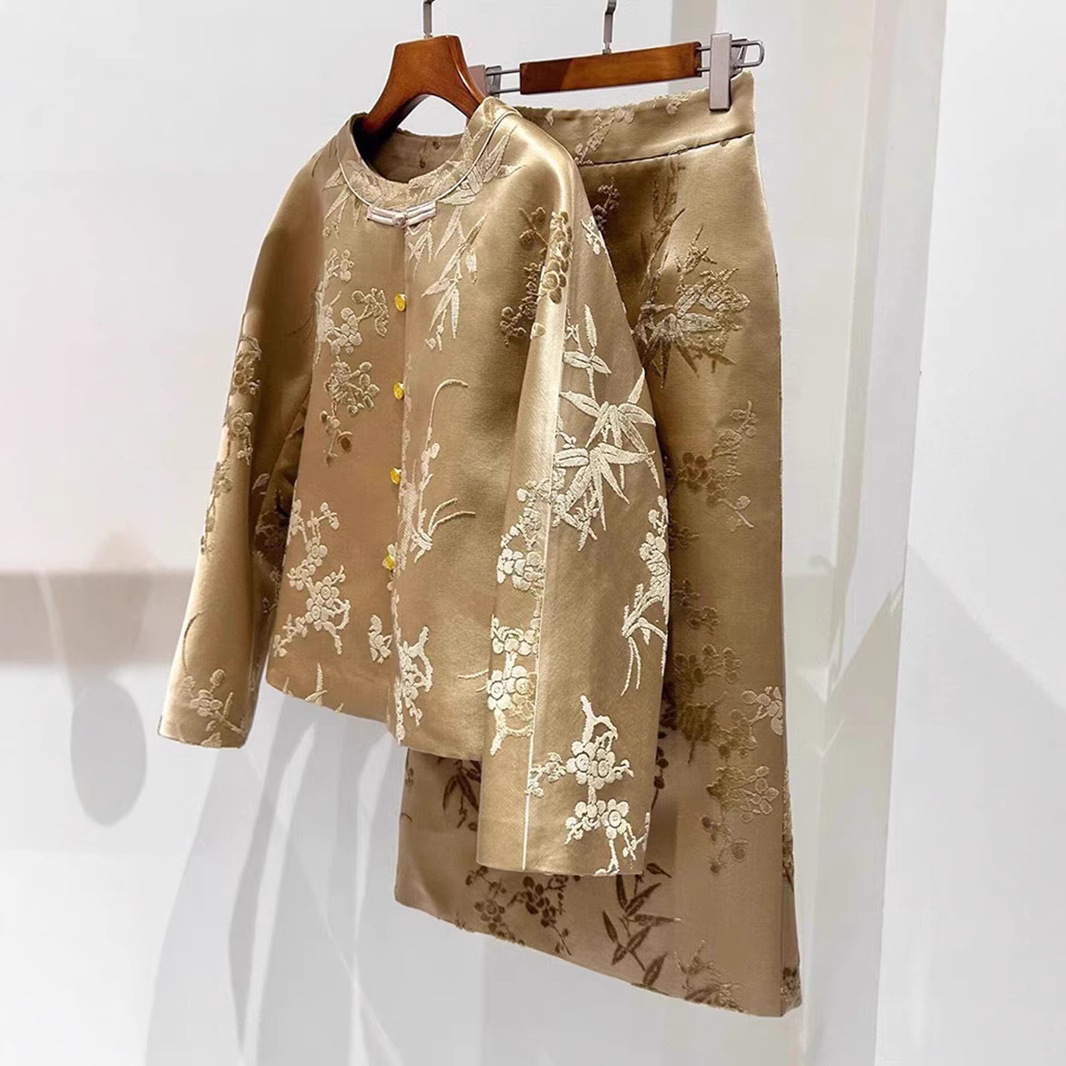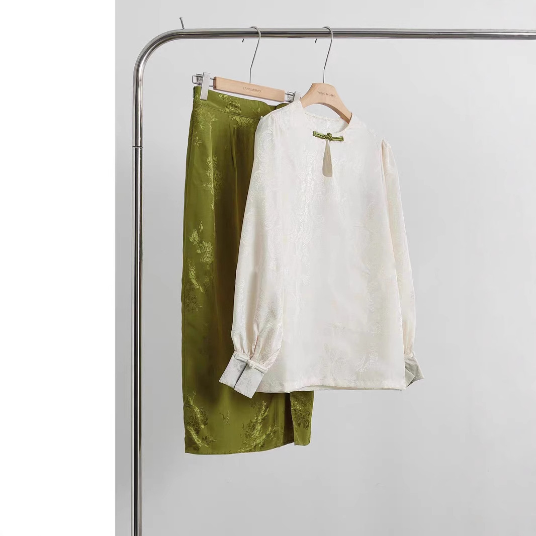 新中国風ジャカードシャツ洋気減齢側開フォークスカートロングスカートセット2025春タイプ女装