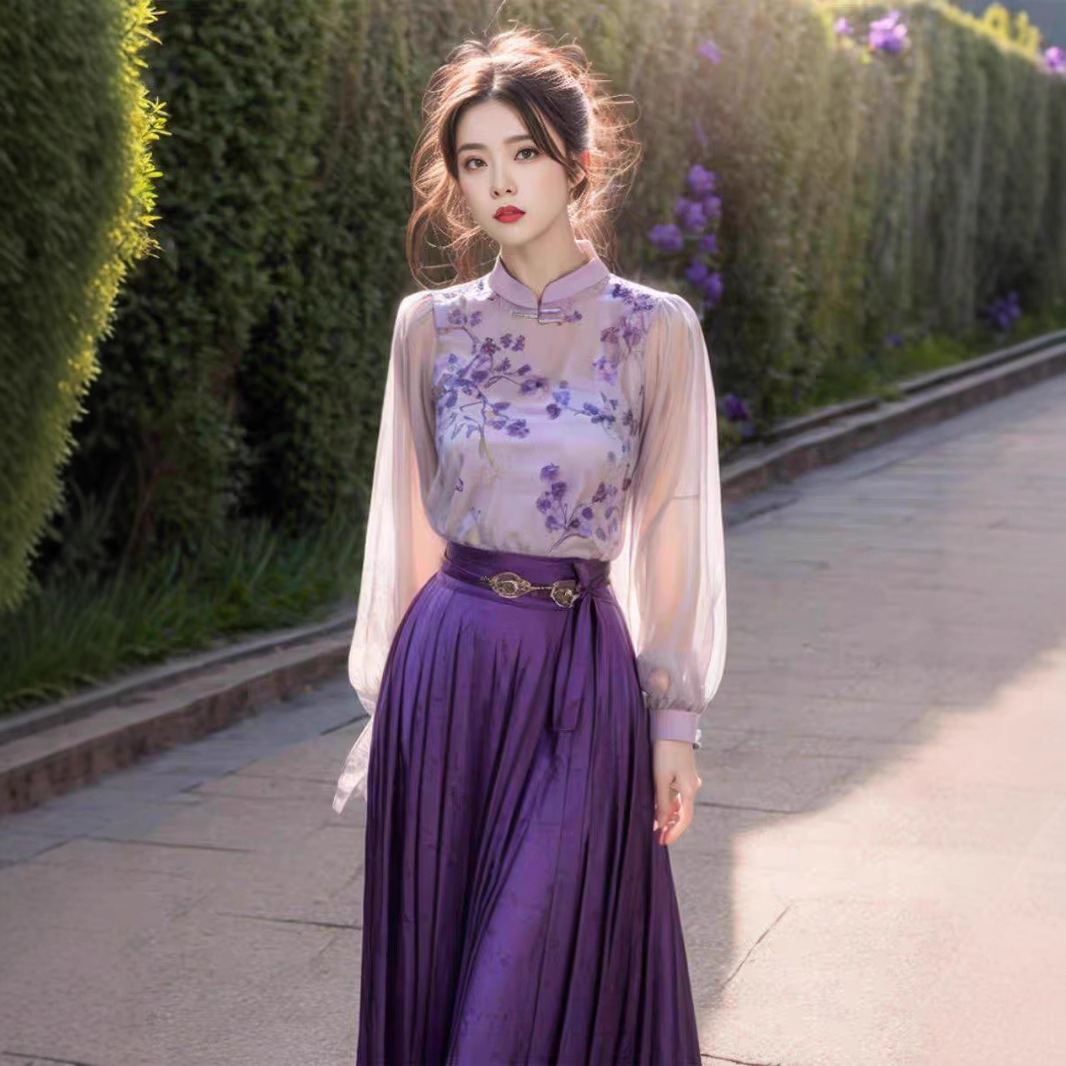 新しい中国風の紫馬面スカートスーツ 2025 新作春と秋の禅女性のクロス襟漢服スカートスーツ