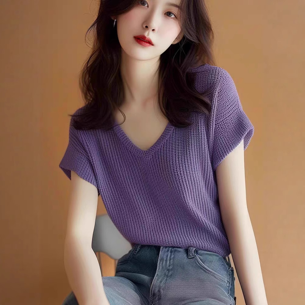 紫メリヤス半袖tシャツ半袖女性2025新作夏洋風爆発モデルシックvネック半袖