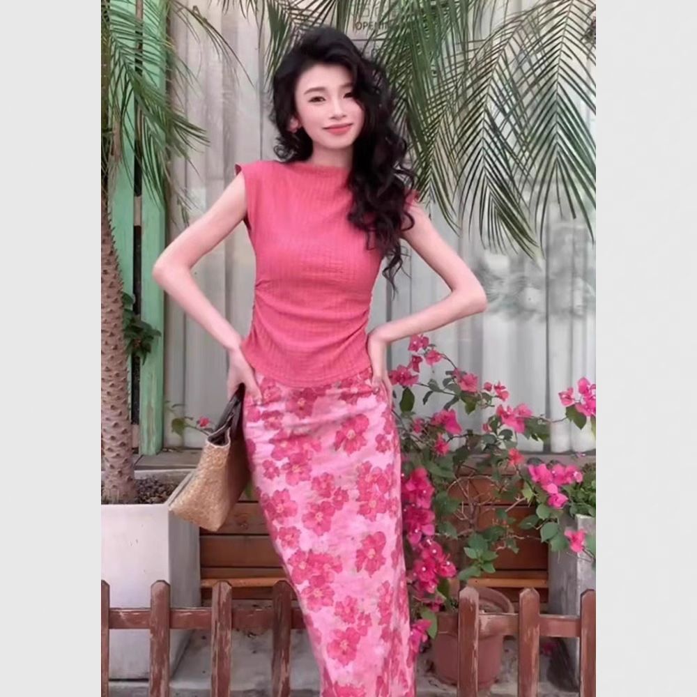 茶休キキョウフランス高級感ヘボン風赤い花のワンピースの春の服の女性2025年の新型のロングスカート