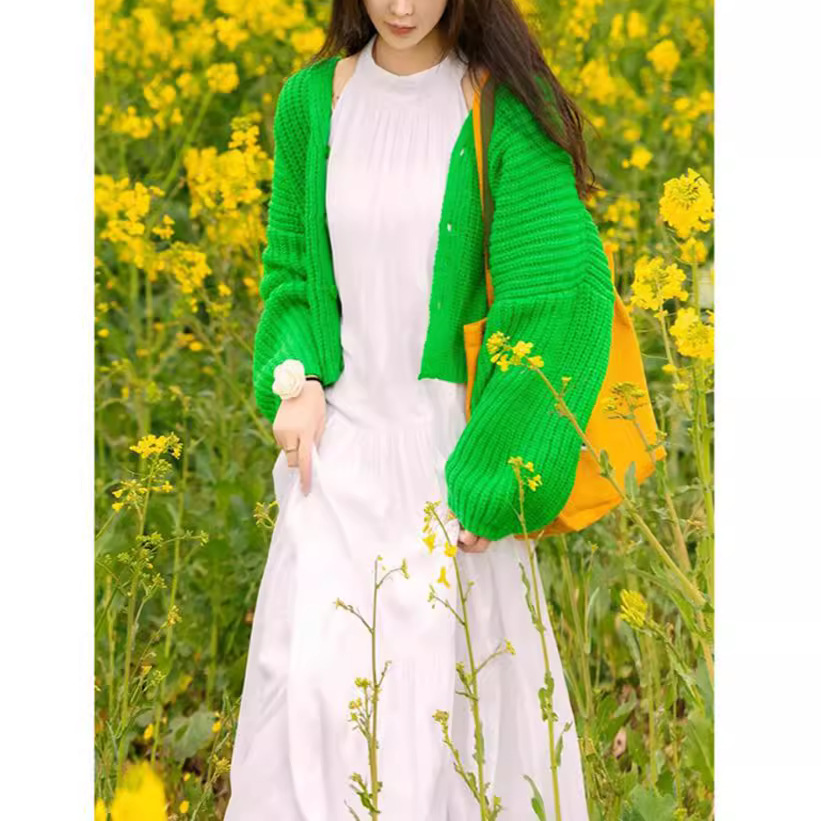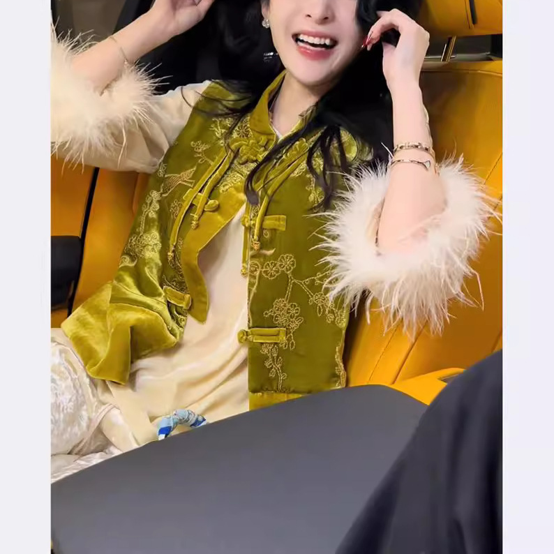 ネット赤同モデル新中国式国風グリーン馬甲高級唐装ベストセット白優しい風2024早春