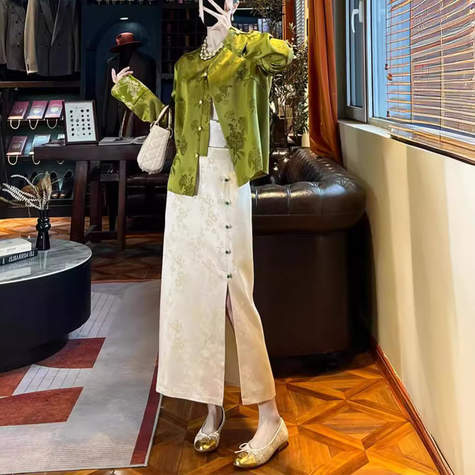 新中国式国風セット唐装グリーンコート半身スカート高級感小洋装2点セット2024早春