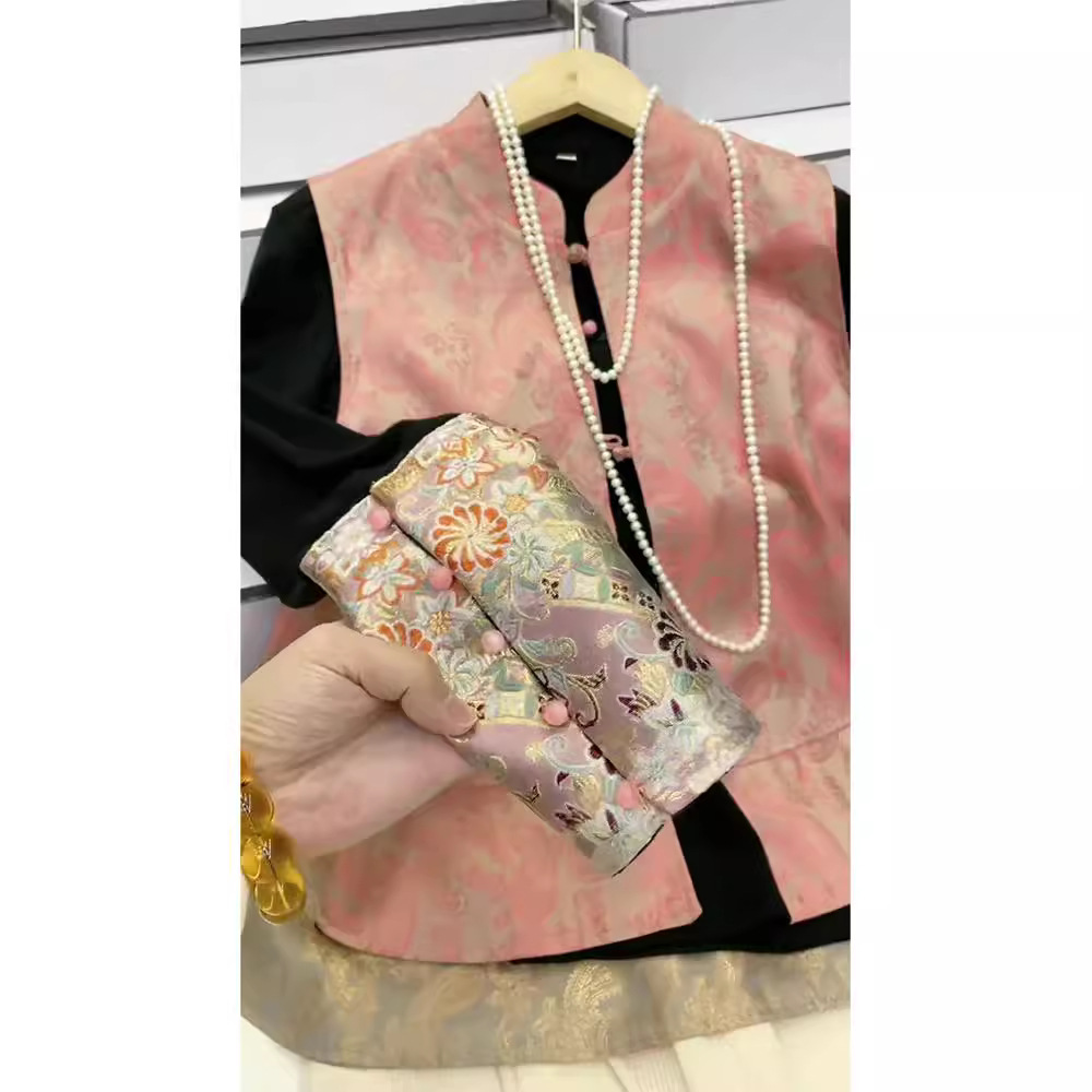 新中国式の国風の底のシャツのピンクの馬甲のスーツの女性の2024早春の新型の高級感の小さい洋服の2つのセット