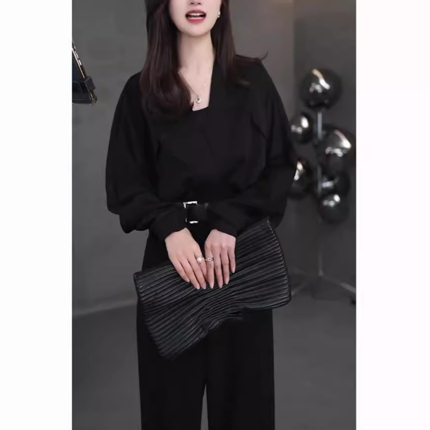 冷淡系レディース高級スーツ春新作ブラックシャツワイドパンツ気質通勤高級感超きれい