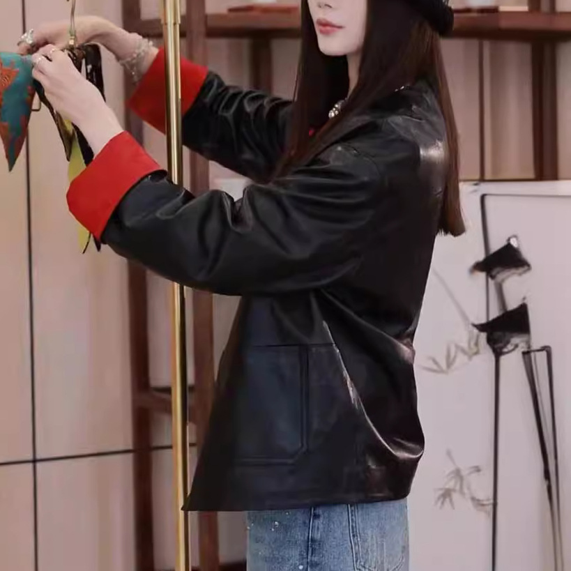 揚げ街の大衆デザイン感高級黒皮衣ファッションカジュアル百合新中国式軽国風コート女春秋