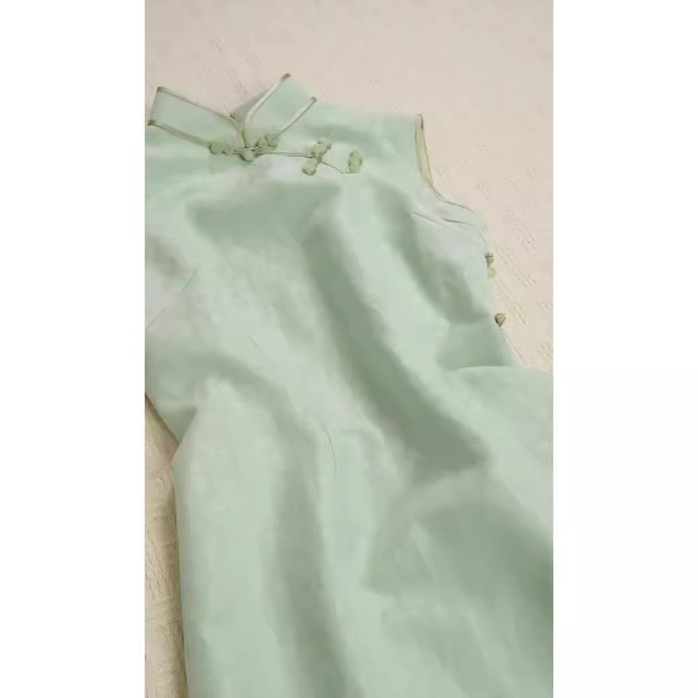 新中国式女装ミントグリーン立襟斜襟ノースリーブチャイナドレス2024春夏民国風千金感ワンピース