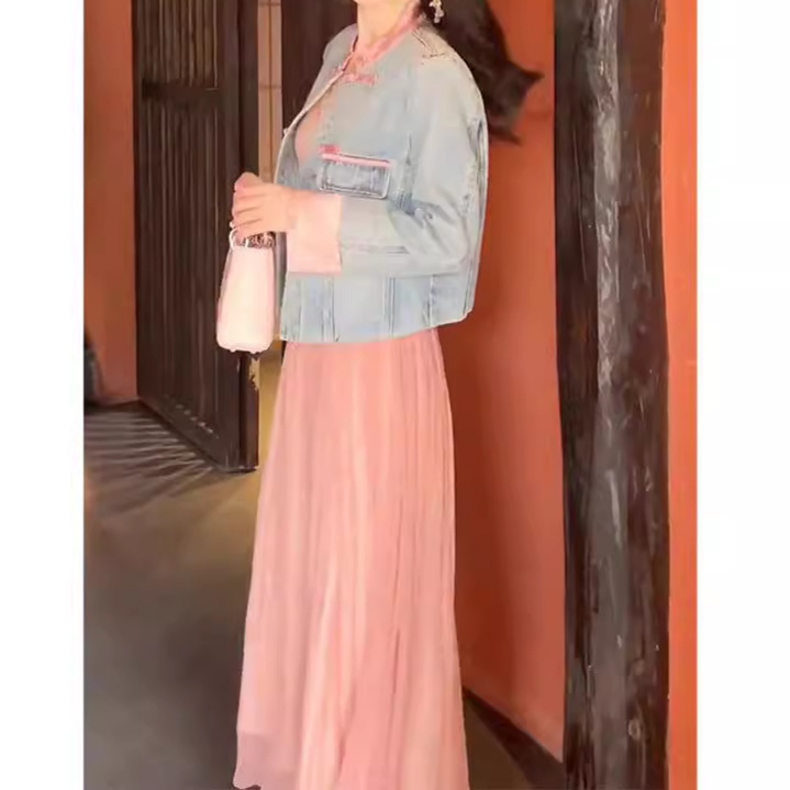 新中国風カウボーイコート高級感富家千金名媛千金風ピンクワンピース春