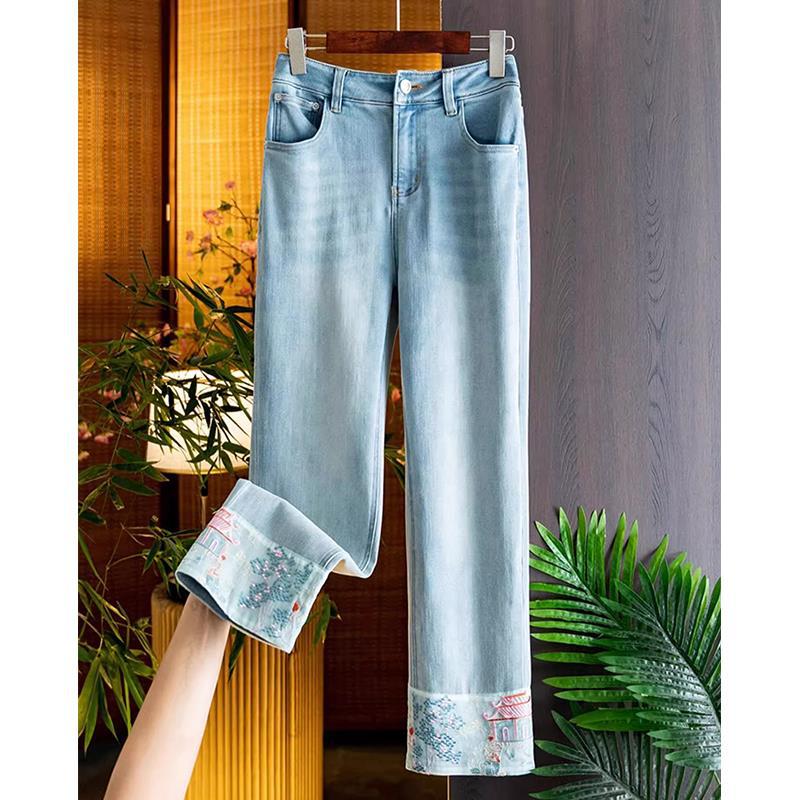今年流行した新型中国風盤は青いジーンズの高腰直筒タバコ管ズボンの子供2024春