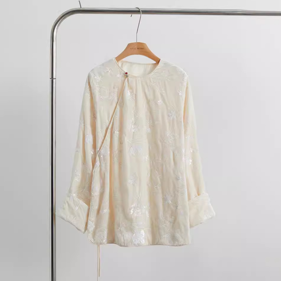 新中国風の国風の白い超美しいシャツの上着の婦人服の2024早春の新型の今年はきれいなシャツが流行します。
