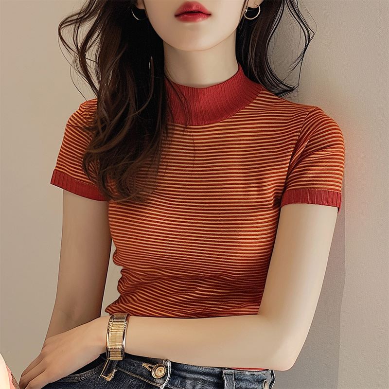 2025年の新しいスタイルのトップスは今年人気の美しいオレンジ色のストライプのニット半袖Tシャツ、女性の夏のスリムフィットです