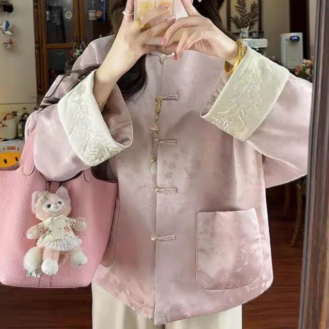 新中国風女装高級唐装上着2024早春新高級感超美しいピンクの短いコート