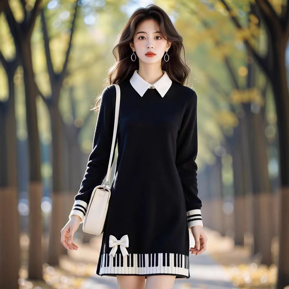 黒いワンピースの女性2025新作春の美しい独特な気質の大衆は金のピアノの鍵にぶつかりません。