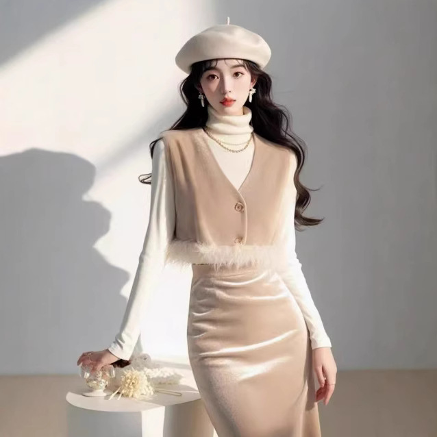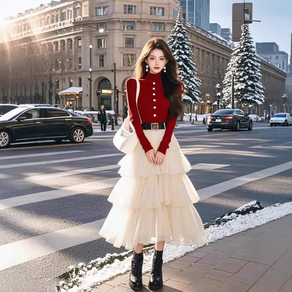 超美しい独特の美しい赤いベルベットの上着白い網糸ケーキのスカートセット2025新型女装秋冬