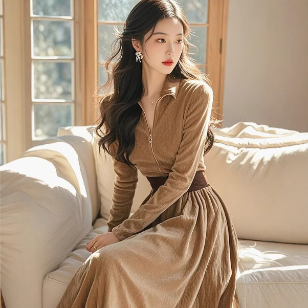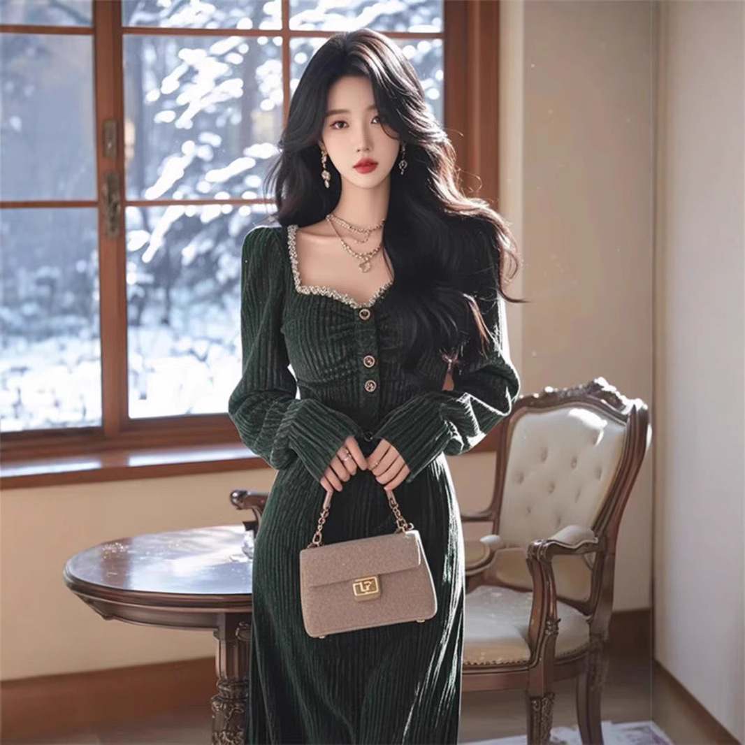 フランスのレトロな緑のコーデュロイのワンピースはきれいで独特な富家の娘がお姉さんの独特な絶景のロングスカートを着ます。