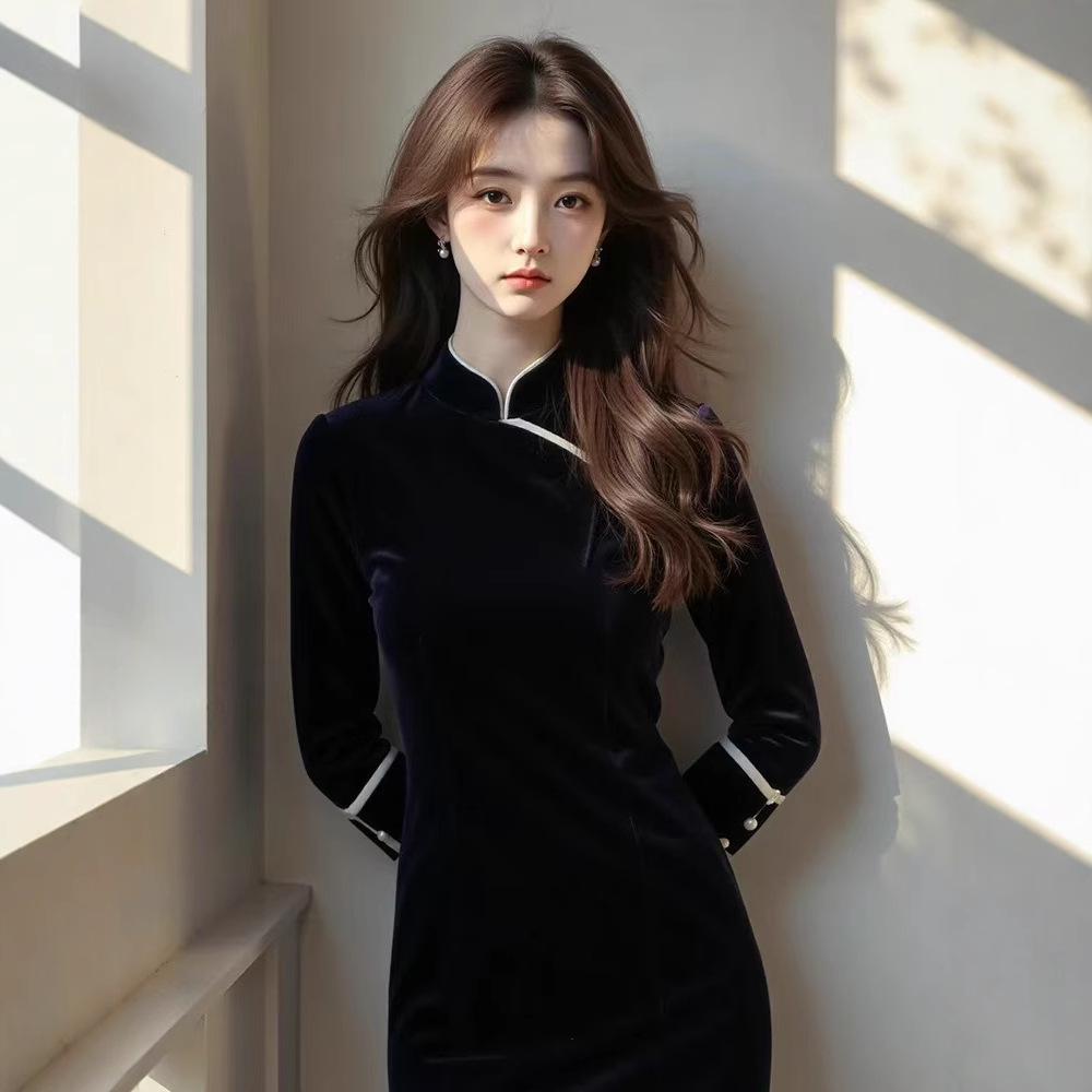 2025秋の新中国式女装チベットブルーの色にぶつかった国風立襟ベルベットのチャイナドレスのスリムなドレス