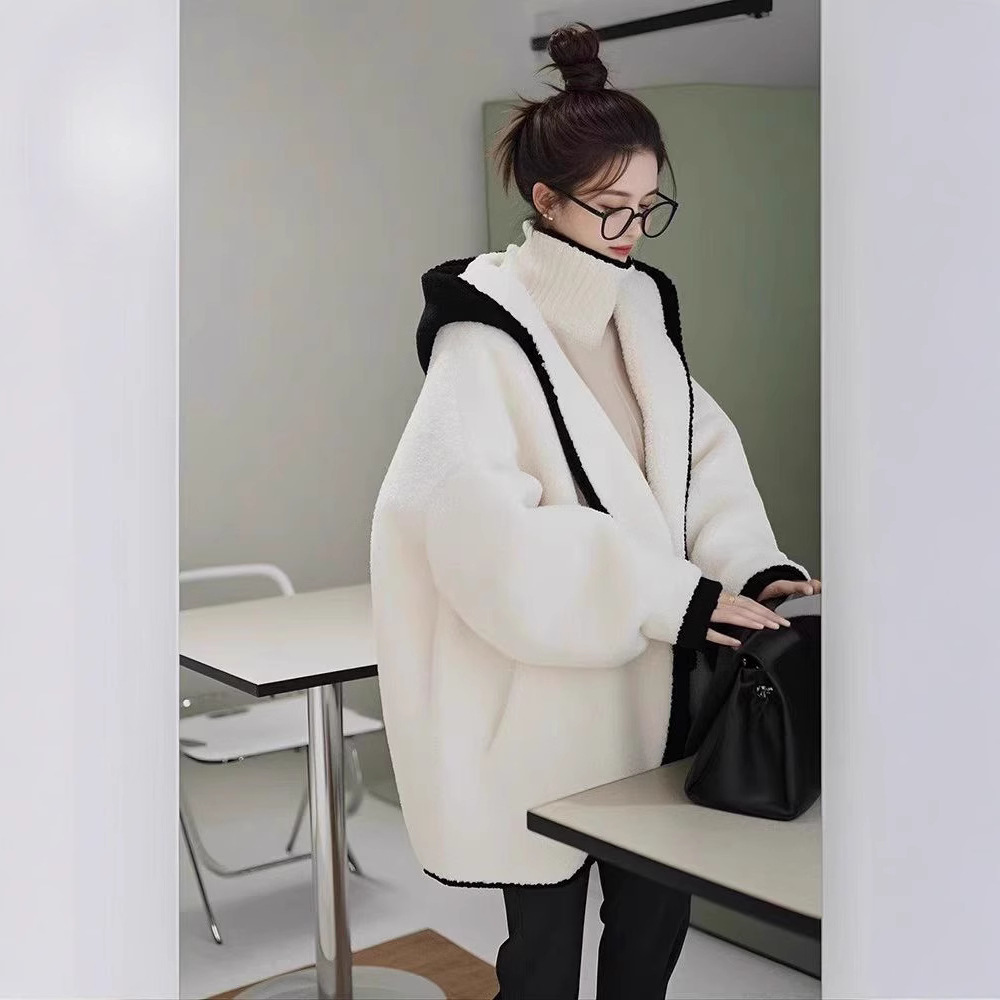 欧品爆金ファッション洋気冷淡系高級感小香風白色フード付きフリース羊の小毛コート冬