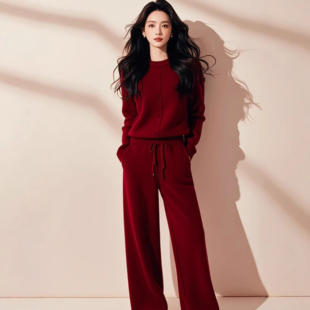 冬には高級感のある赤いニットの上着を着て、お姉さんの独特な美しいスーツを着ます。