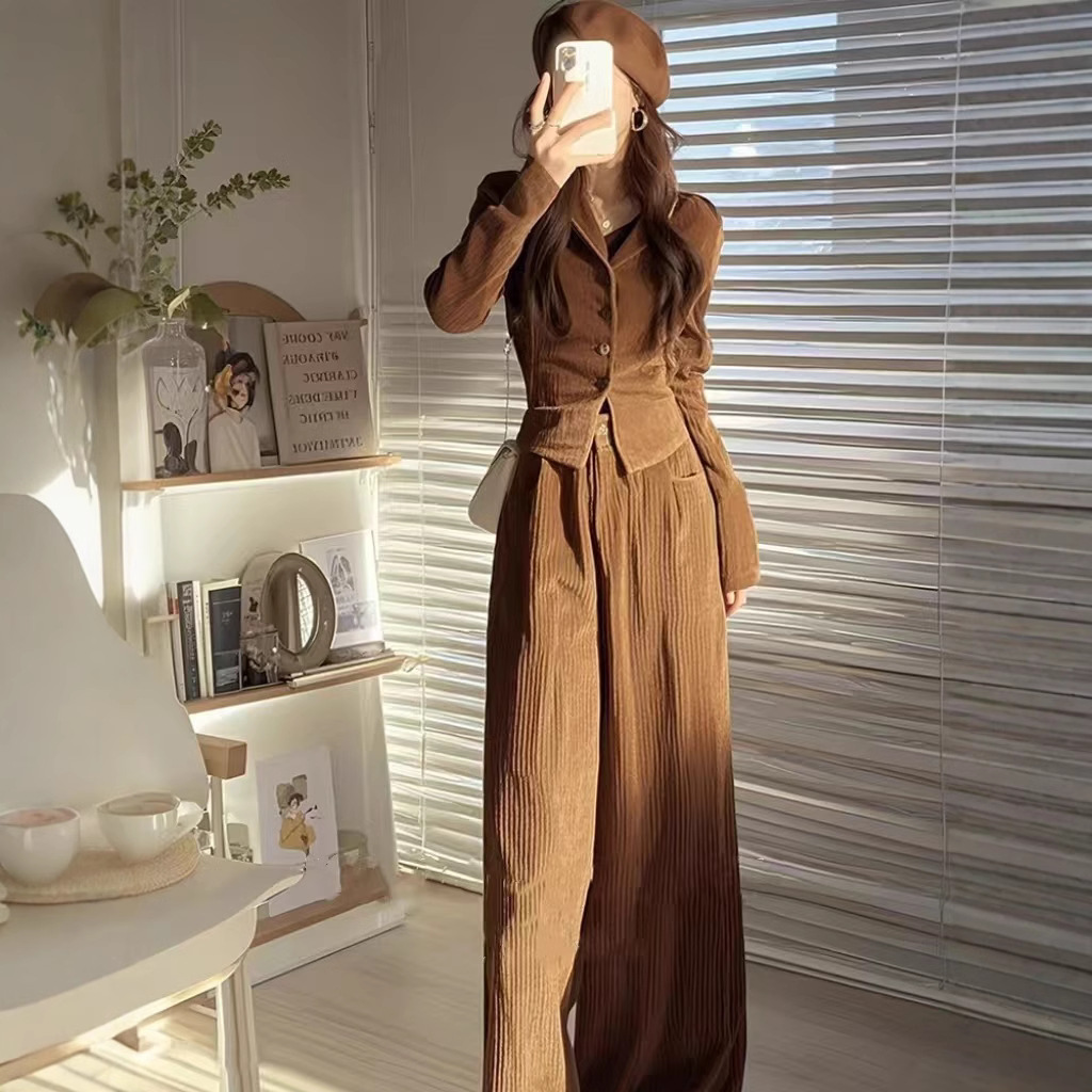 一セットのootdクール颯爽はお姉さんを引っ張って高級感のカジュアルな韓国系chiの独特なカレー色のコーデュロイのスーツのズボンを着ます。