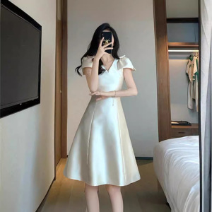 2025新型は今年流行しています。金持ちの娘は高級感があります。白いサテンのフリルの縁のワンピースを着ています。