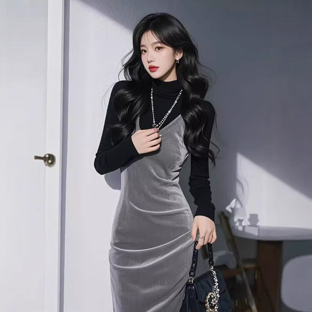今年はおしゃれなお姉さんの黒い高襟のニットの銀の灰色のガーターのベルベットのワンピースのスーツが流行っています。