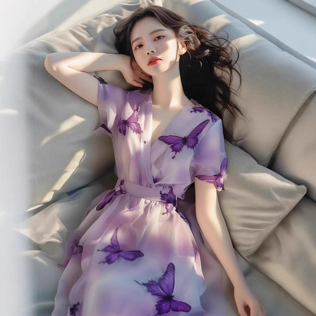 2025新型女性夏茶休フランス式絶美vネックウエストシフォン長スカート紫蝶プリントワンピース