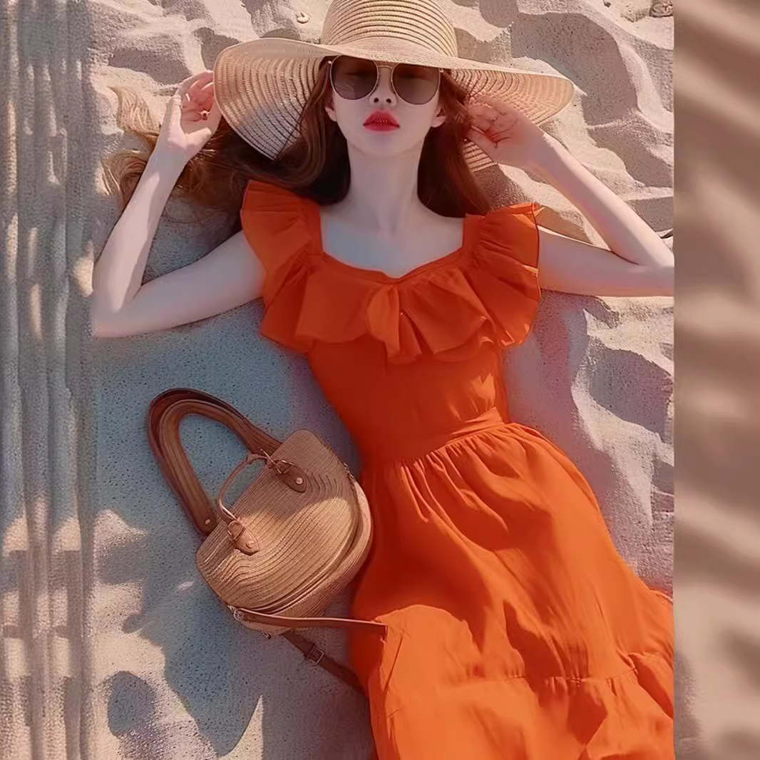 オレンジ色のハスの葉の縁のワンピース2024の新型の女性の夏のドーパミンのハイエンドの小さい衆のアンドロメダのスカートの気質は超仙です。