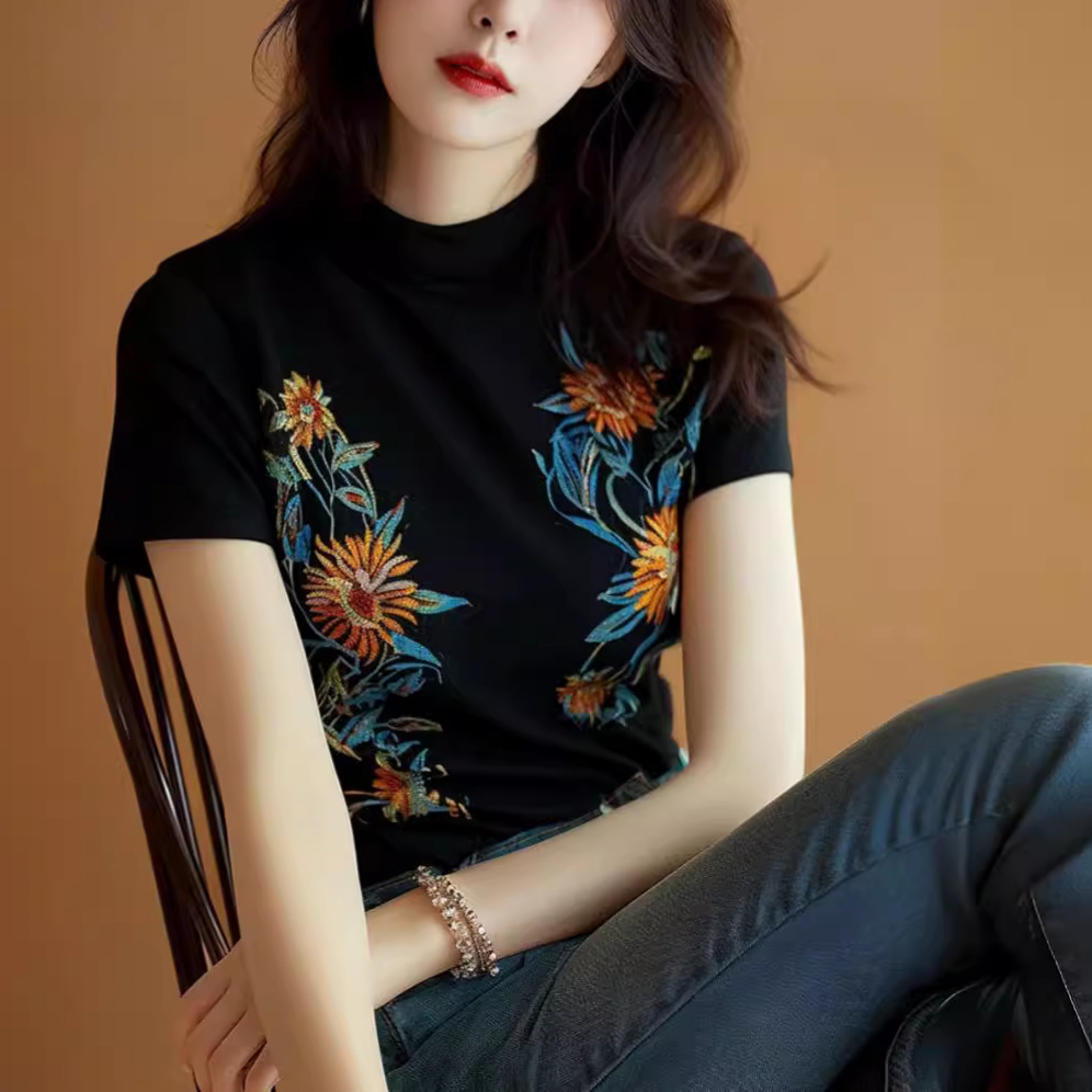 ヨーロッパの商品の気質の黒い花の花の半袖のtシャツの女性の2024新型の独特な上着はとてもきれいです。