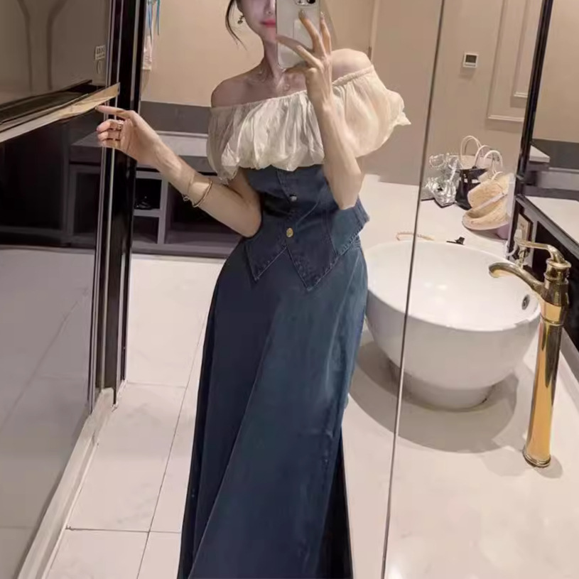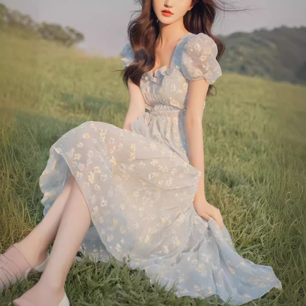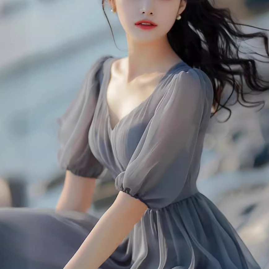 夏2024新作灰色シフォンワンピース韓国系気質女神範フランス高級感があります。