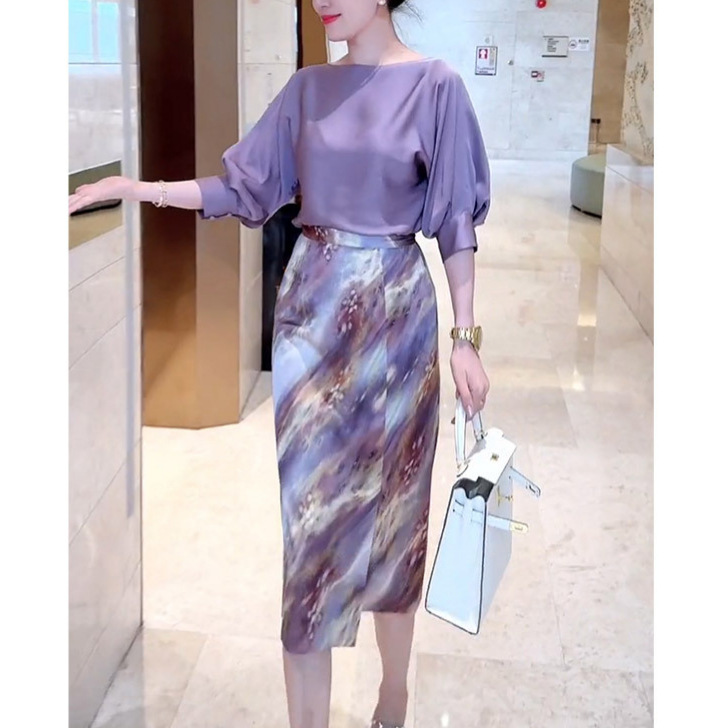 気勢の強い女装のお姉さんは街の職業の紫色のシフォンのシャツの半身のスカートの冷たい風の塩を揚げてセットを着ます。