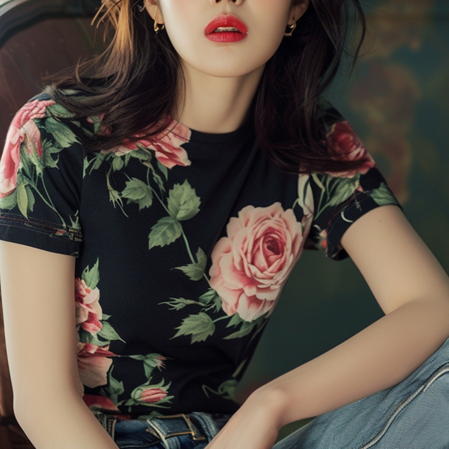 黒い花のプリントの半袖のtシャツの女性の正肩の2024の新型のデザイン感の小さい大衆の夏の修身はやせている上着を現します。