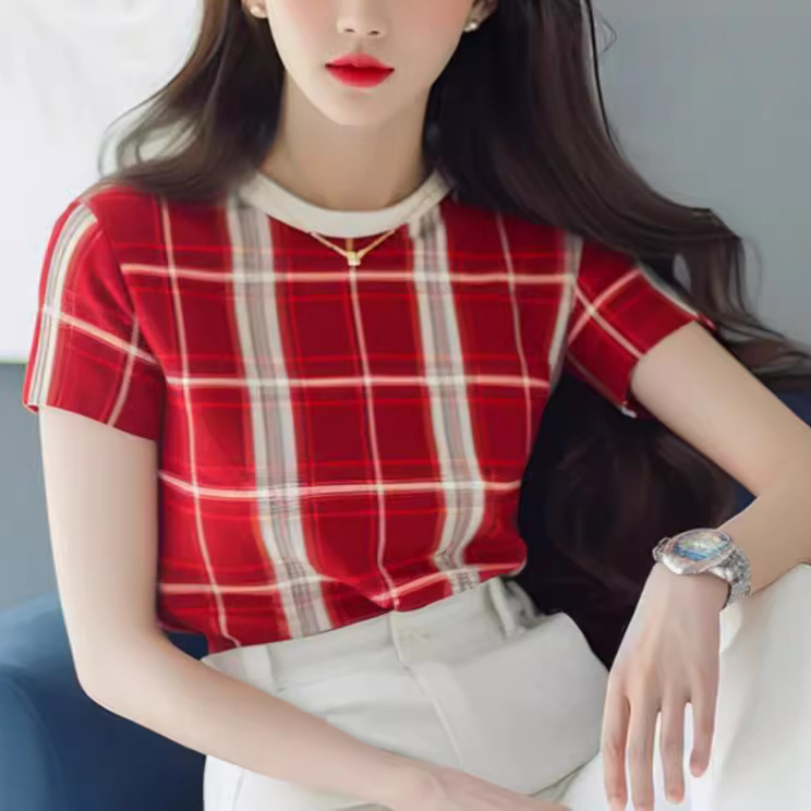 フランスの高級感の赤い格子縞の半袖のtシャツの女性の2024の新型の独特な小さくて太い肩の上着は腹を覆います。
