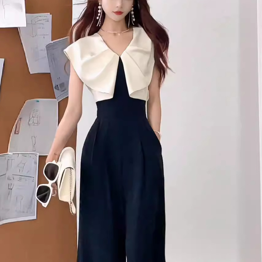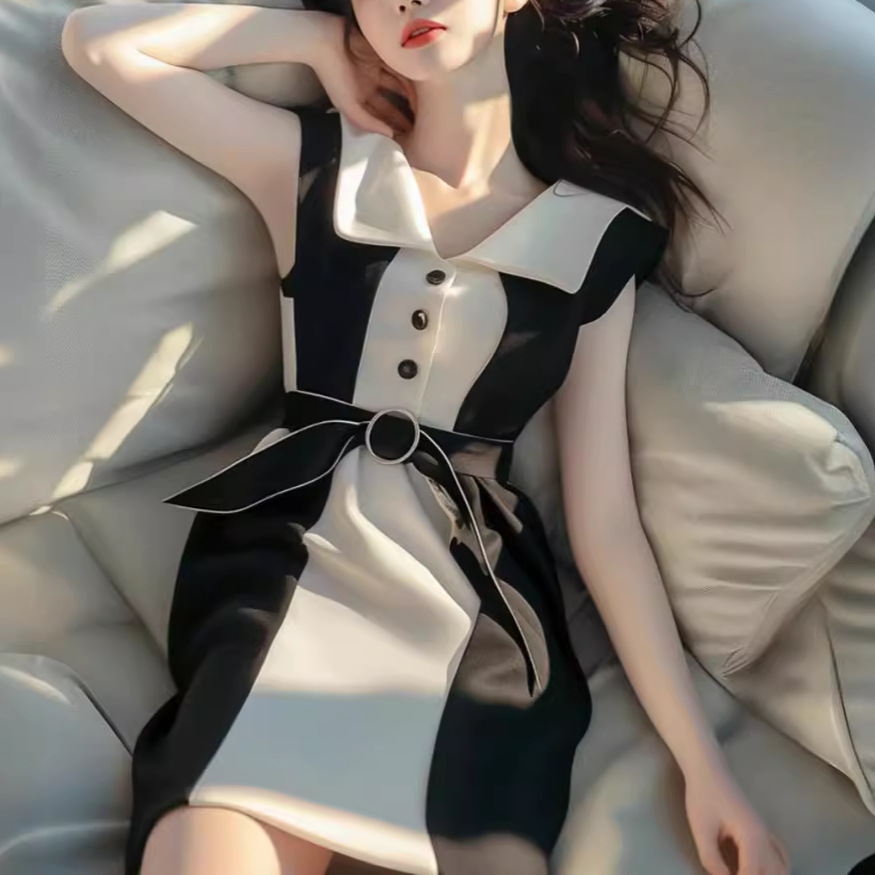 2024新型女性夏気質女神范軽贅沢高級感腰polo襟白黒衝突色つなぎワンピース