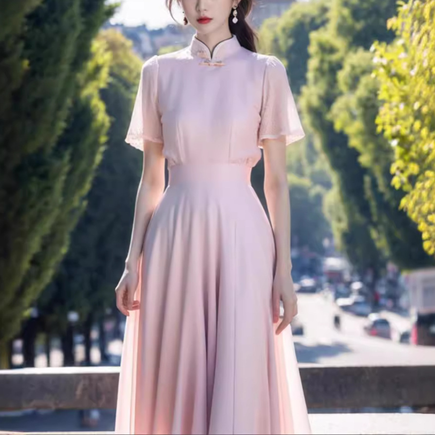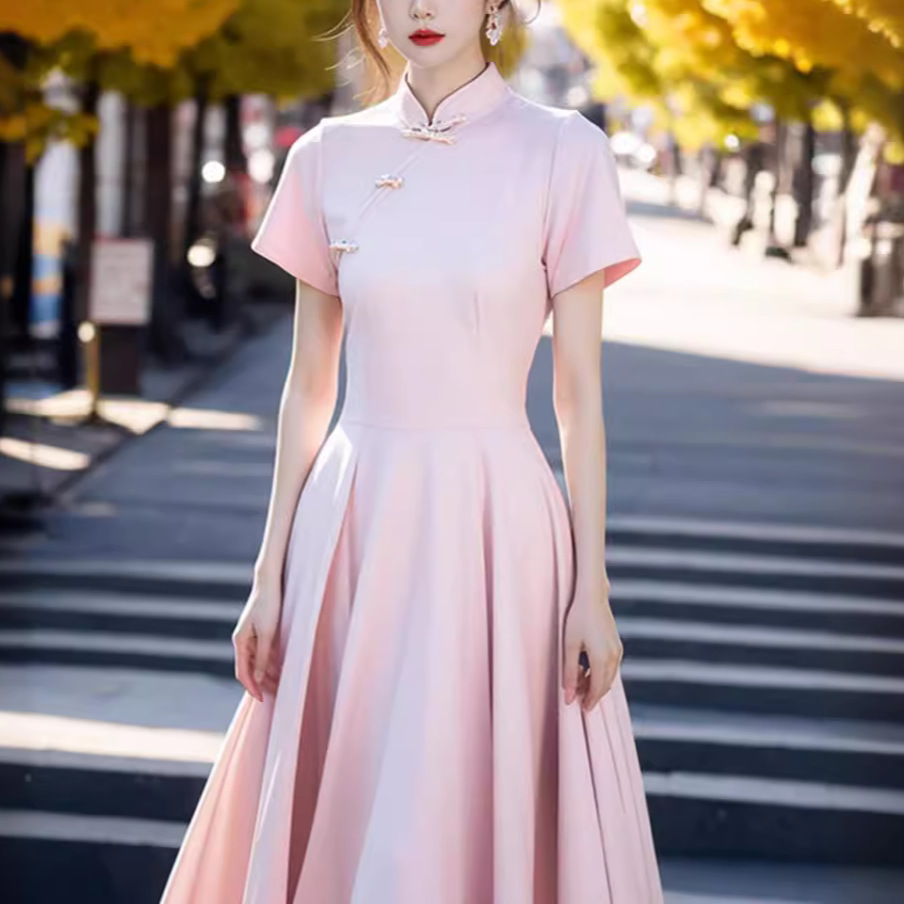 新しい中国式の婦人服のピンクの立襟の若いタイプのチャイナドレスのワンピースの夏の新型のナシの形の体つきはやせている国風のスカートを現します。