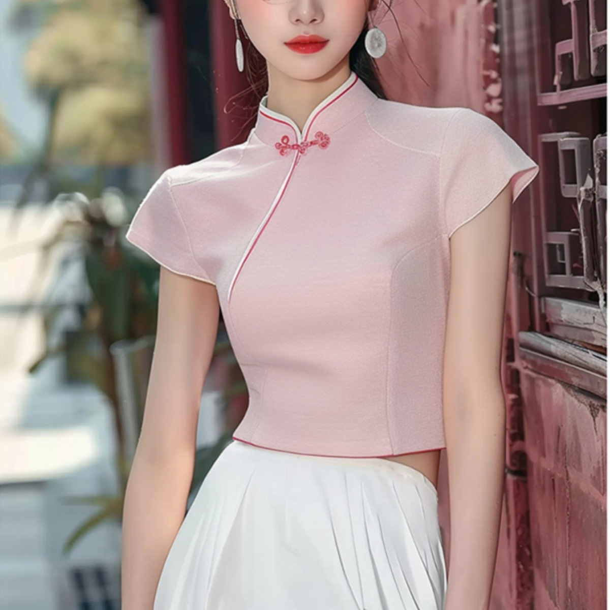 新中国式女装ピンク国風盤ボタン小飛袖シャツ夏の新型シンプルな無地tシャツ上着