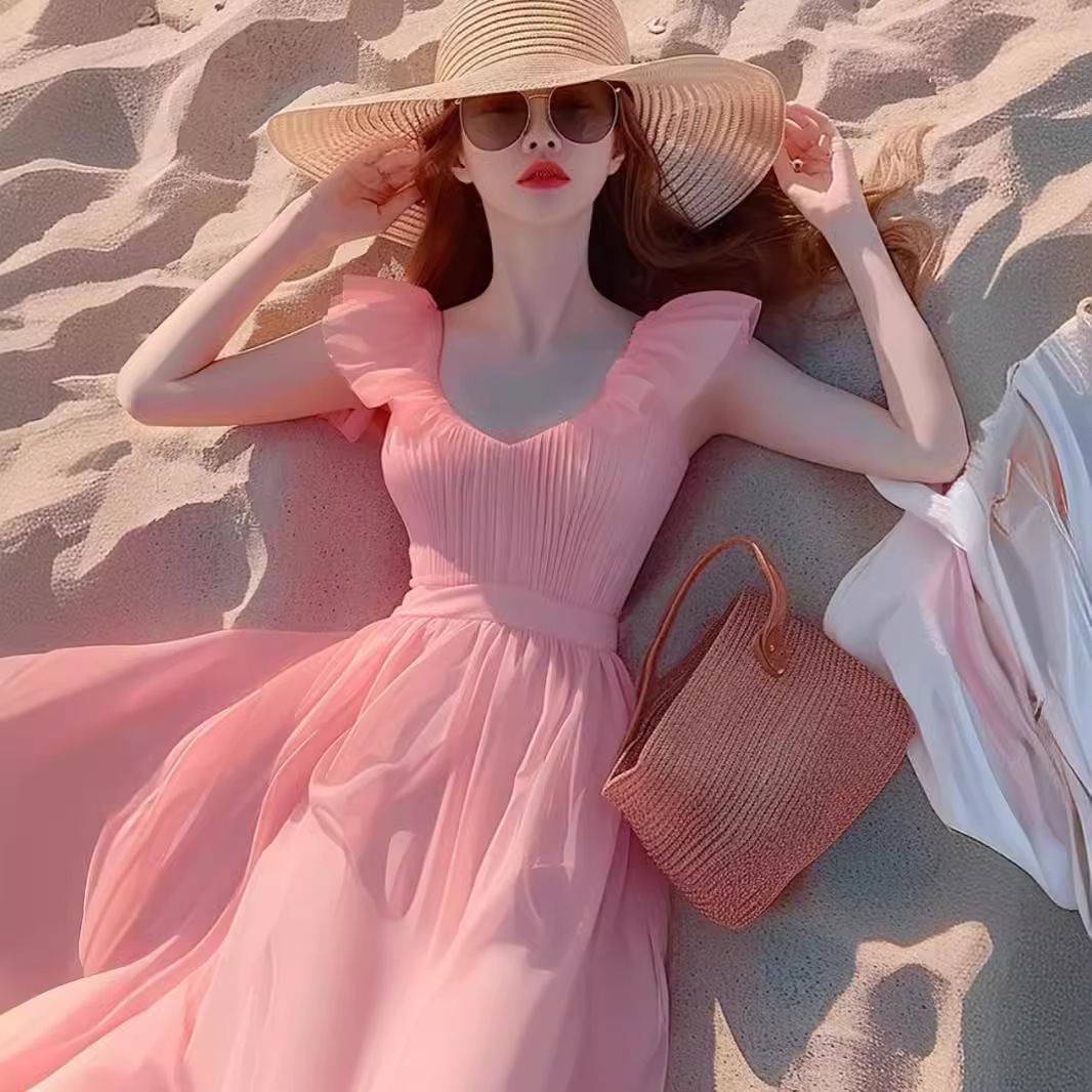 ピンクの小さい飛袖のワンピースのロングスカートの女性の夏の2024新型の高級な精巧なフランス式の絶景のリゾート風のスカート