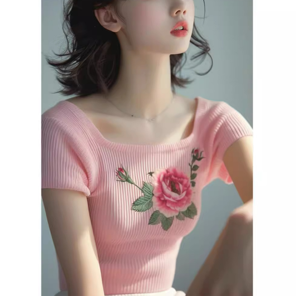 ピンクのプリントの半袖のtシャツの女性の2024の新型の夏のドーパミンの気質の名媛の女神の範の短い上着