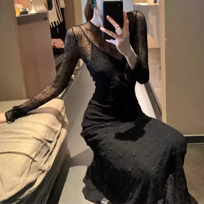 夏のセクシーな婦人服の黒い透かし彫りのレースのワンピースの高級なフランス式のお姉さんの気質はスタイルを現してお尻の長いスカートを包みます。