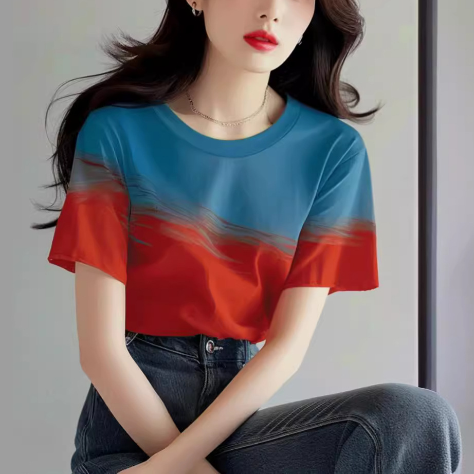 赤ぼかし半袖tシャツ女性2024新起爆夏ファッション洋気衝突色tシャツ上着高級感