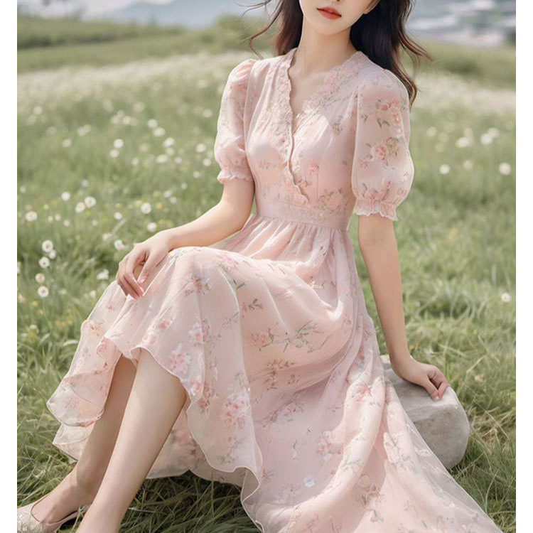 ピンクの花のワンピースの優しい風のお茶の休憩のフランスのハイエンドの美しい初恋の気質は腰のアンドロメダのスカートの夏を収めます。