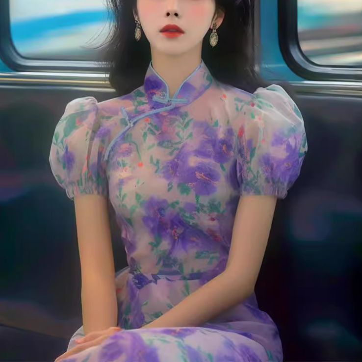 新中国式女装風信紫泡袖砕花チャイナドレス夏の新型大衆デザイン雪紡織ワンピース