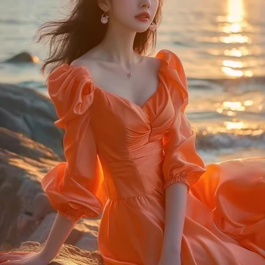ドーパミン海辺はオレンジ色のサテンワンピース2024春の女装高級洗練された気質のフレンチスカートを着ている
