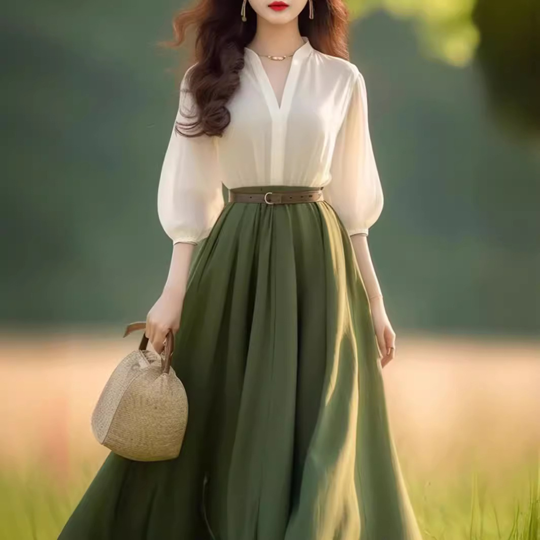 2024年春レディースグリーン偽2枚シャツワンピース高級感海辺リゾート千金風つなぎスカート
