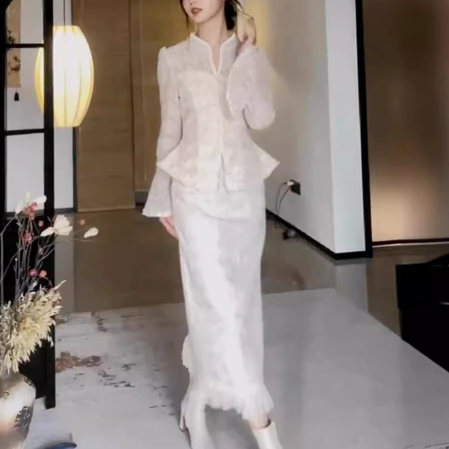 春には新しい中国風の白いレースのコートを着て、チャイナドレスのスカートを改良します。