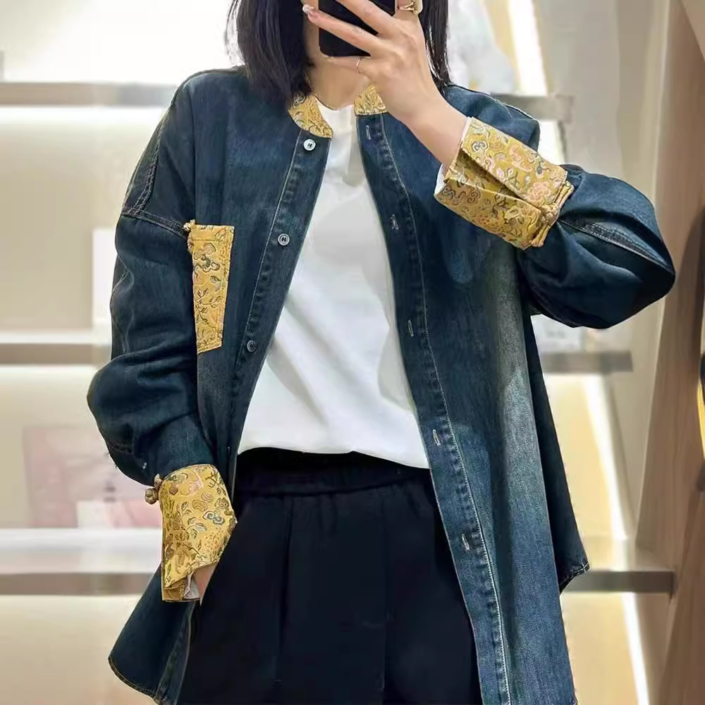 2024早春の新型新中国式の軽国風盤は洋風の独特なシックな上着のレトロな青いデニムのシャツを掛けます。