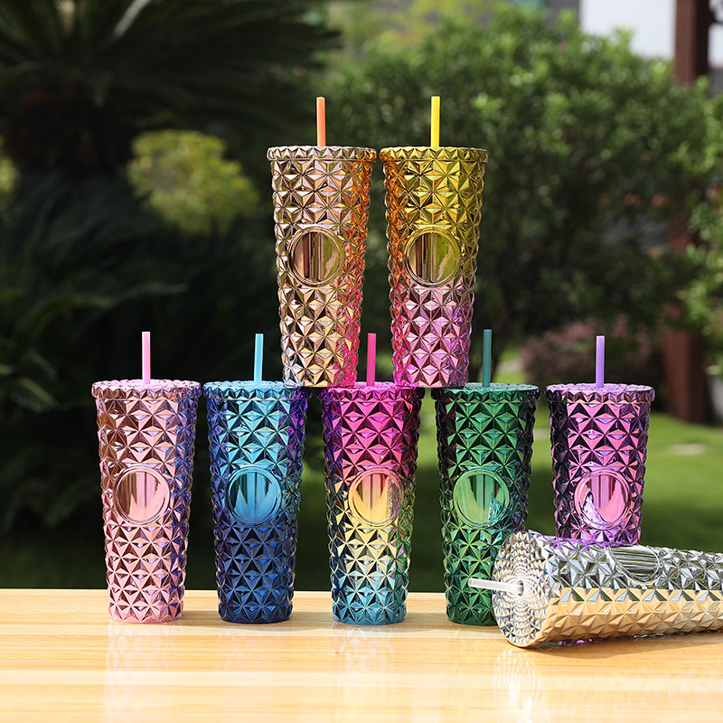 メーカー直販 越境販売 二層構造プラスチックカップ 大容量 女性向け 電気メッキ ドリアン柄 ストローカップ ウォーターカップ 越境で人気商品