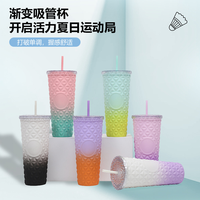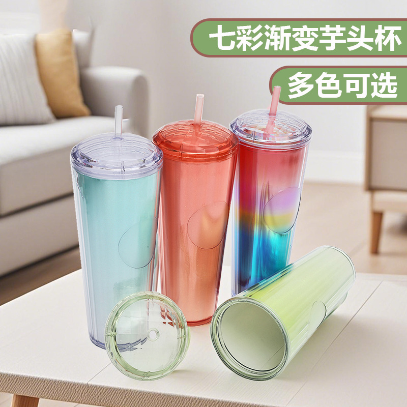 シンプルな24オンス大容量カップフロストカップ携帯虹グラデーション二重プラスチックストローカップ屋外