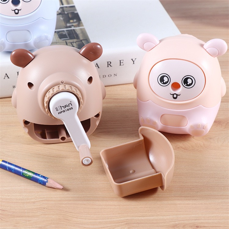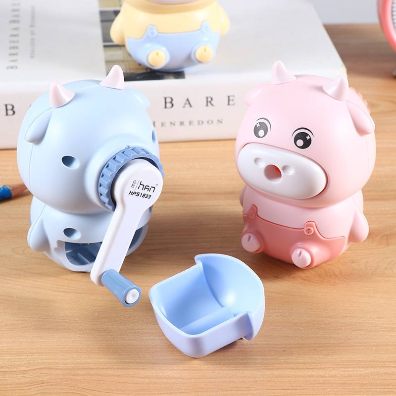 まぶしい翰の漫画の子牛の自動鉛筆削り機の漫画の手は鉛筆の刀のかわいい鉛筆を巻いて、鉛筆の刀を削ります。