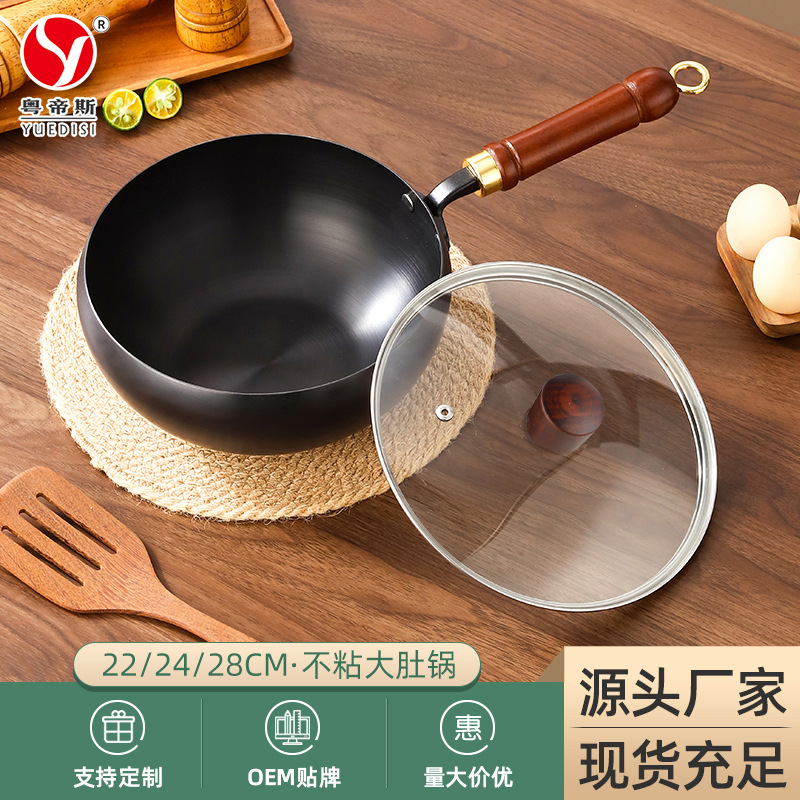 工場直接供給昔ながらの鋳鉄鍛造中華鍋家庭用無塗装ノンスティック鍋蓋付き大腹鍋卸売