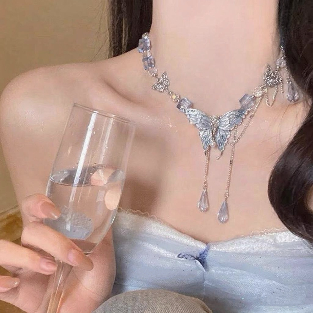 ヘビーデューティブルークリスタルタッセルバタフライネックレス女性ニッチデザイン鎖骨チェーンビーズチョーカーネックレスアクセサリー